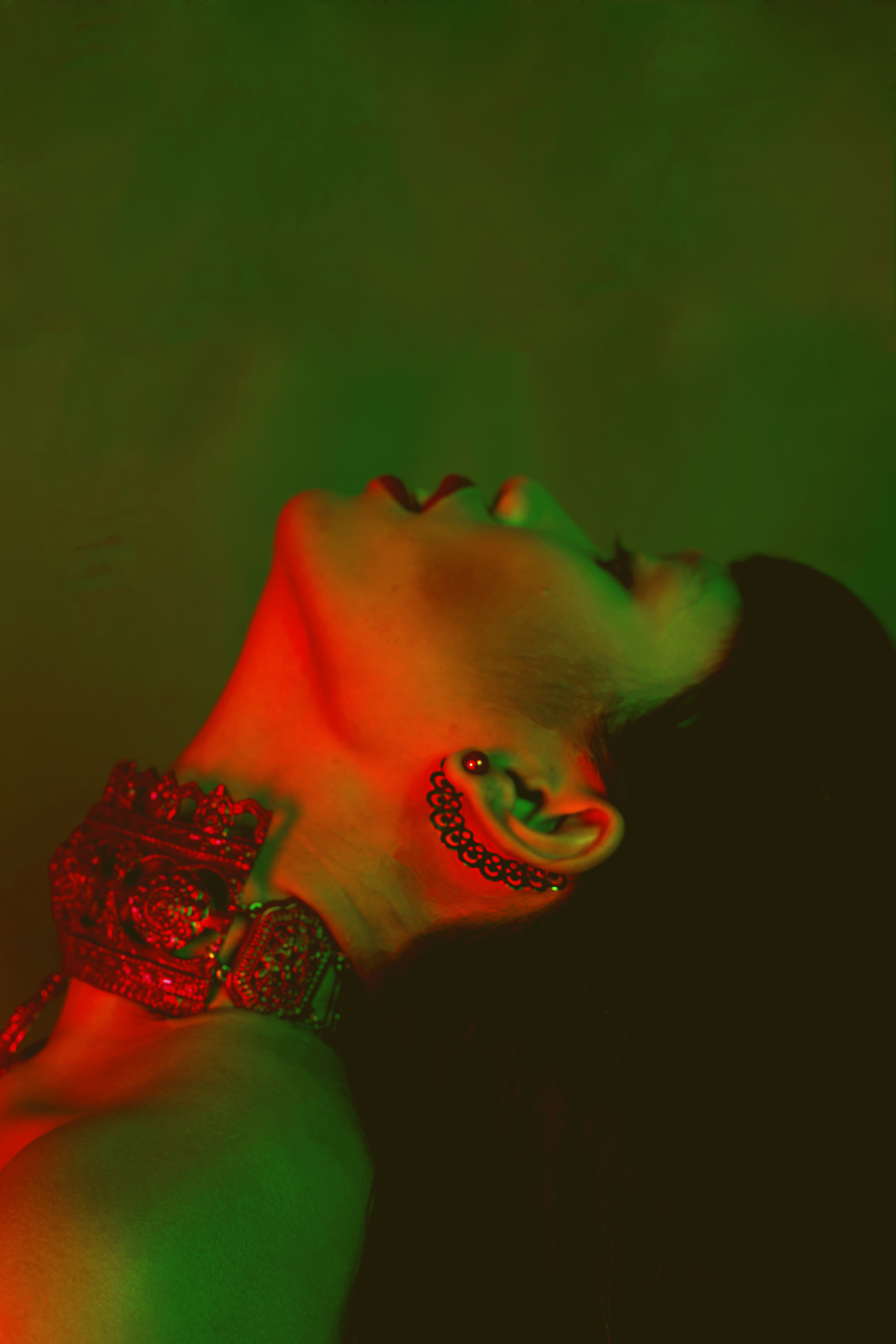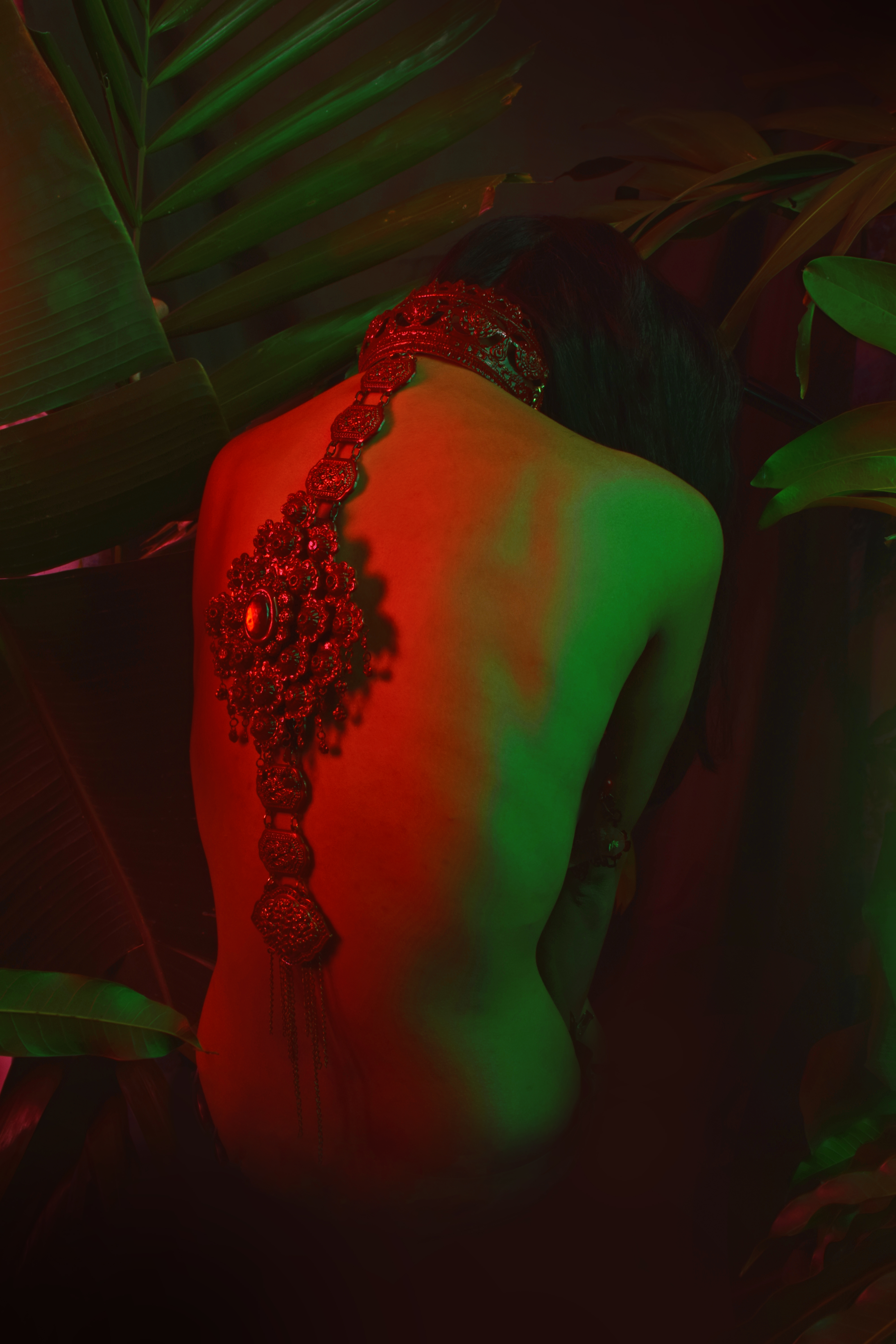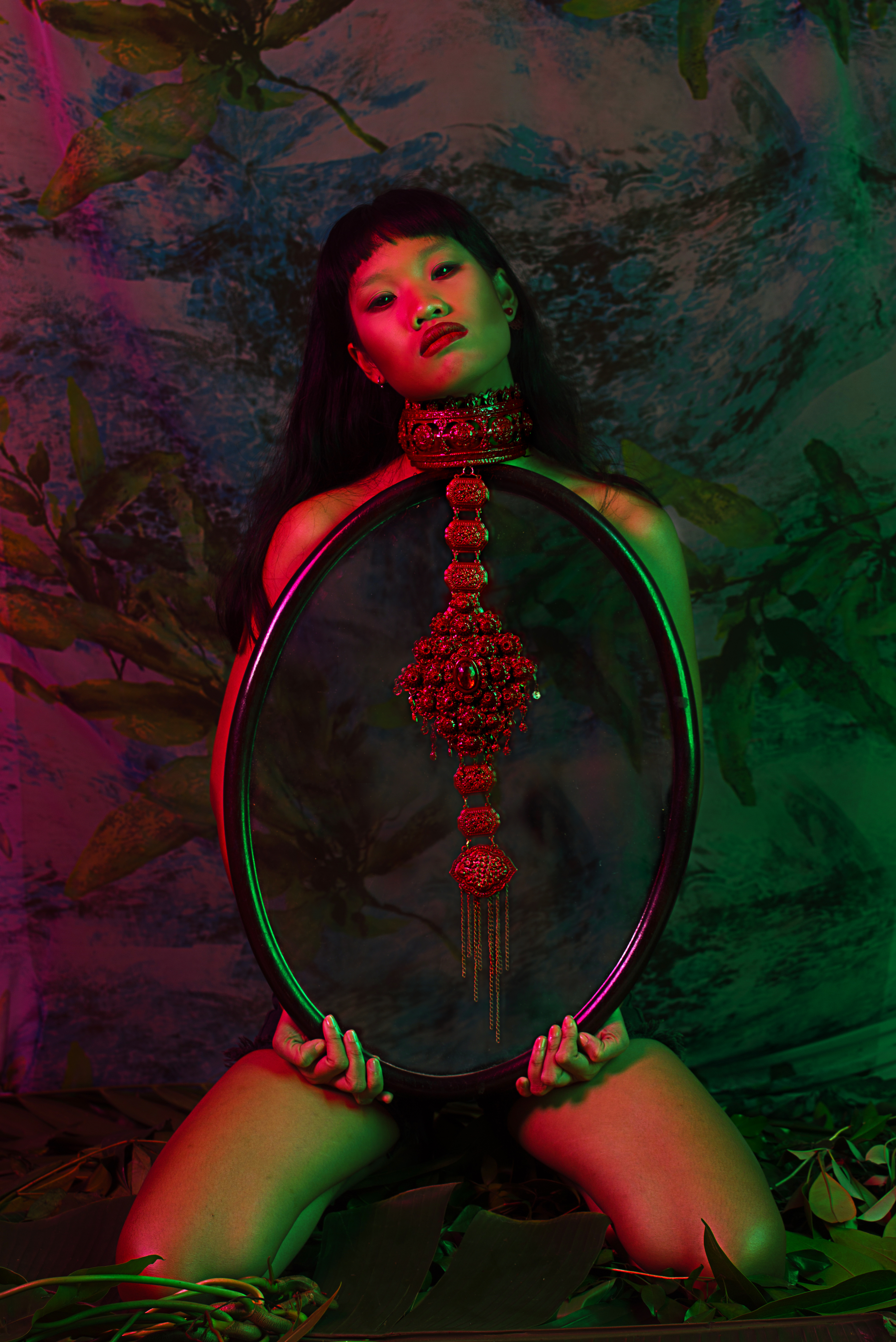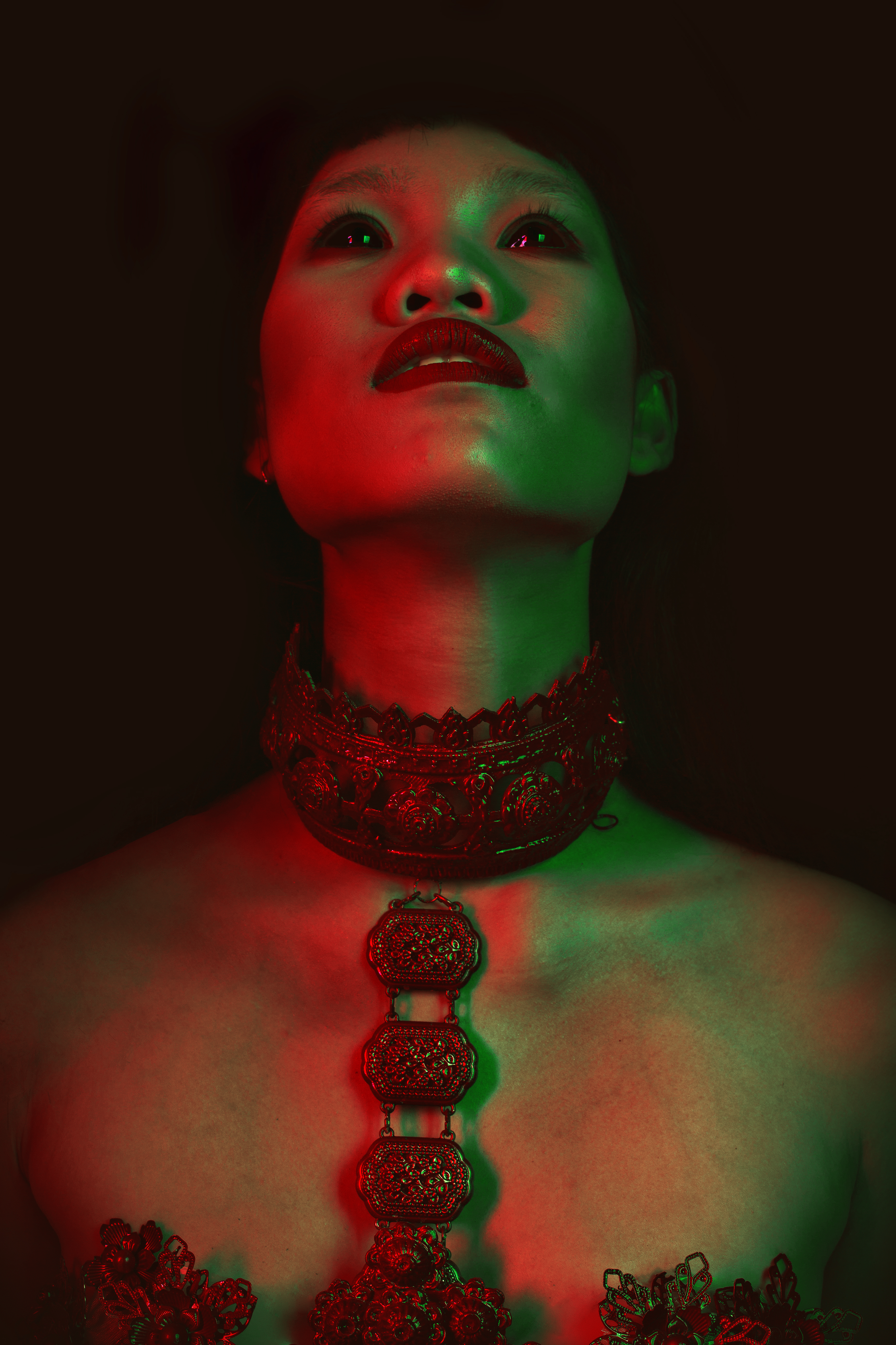 This artwork is a conceptual photograph that tells the story of Kra-Sue through a necklace on a woman's neck, inspired by the internal organs of Kra-Sue, crafted from metal to represent the haunting moment. The photographs are titled Imprisonment.